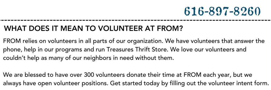 We are blessed to have over 300 volunteers donate their time at FROM each year, but we always have open volunteer positions.