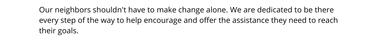 Our neighbors shouldn’t have to make change alone. We are dedicated to being there every step of the way to help encourage and offer the assistance they need to reach their goals.
