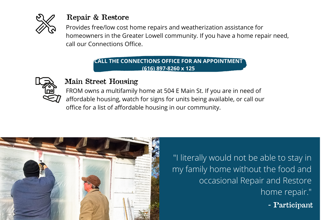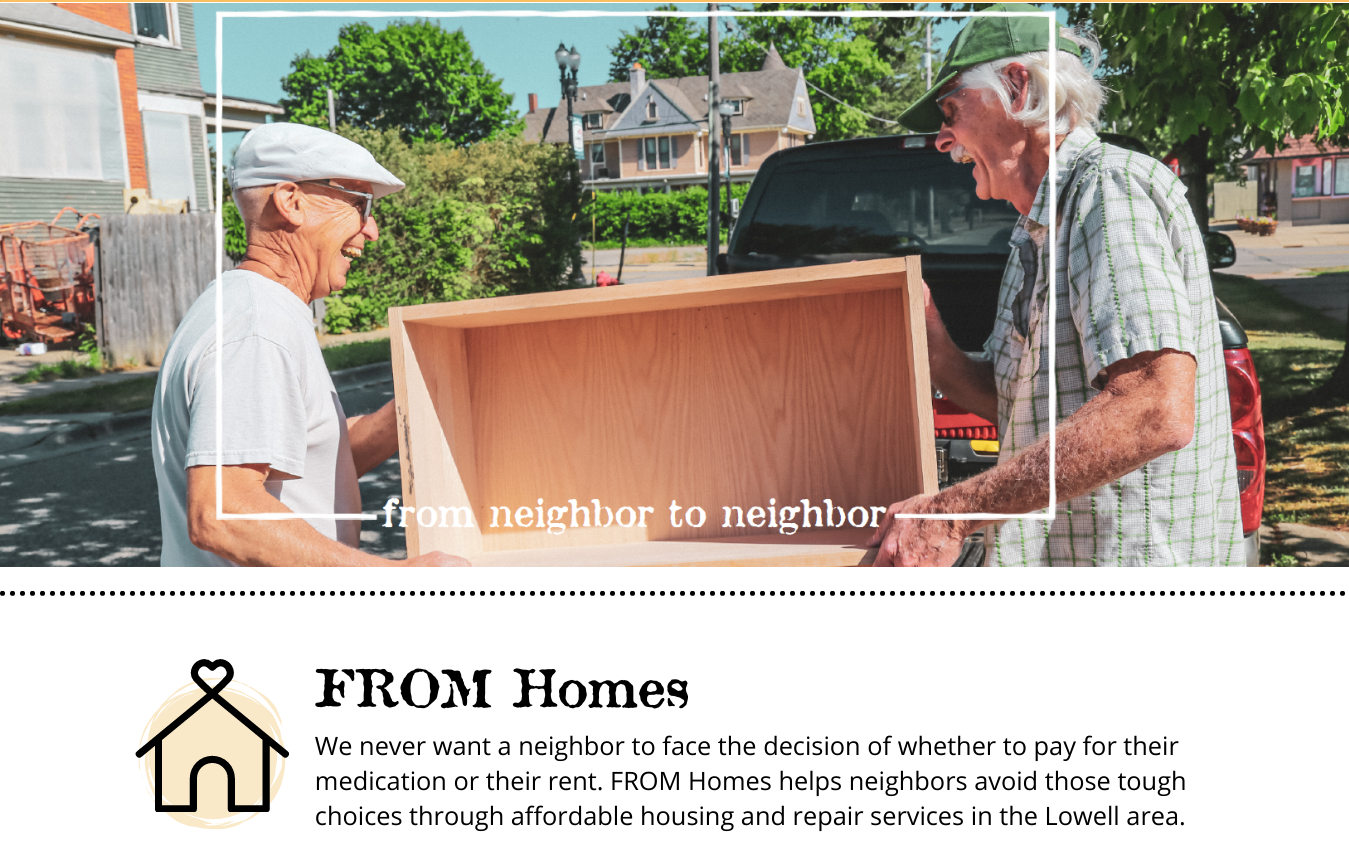 We never want a neighbor to face the decision of whether to pay for their medication or their rent. FROM Homes helps neighbors avoid those tough choices through affordable housing and repair services in the Lowell area.