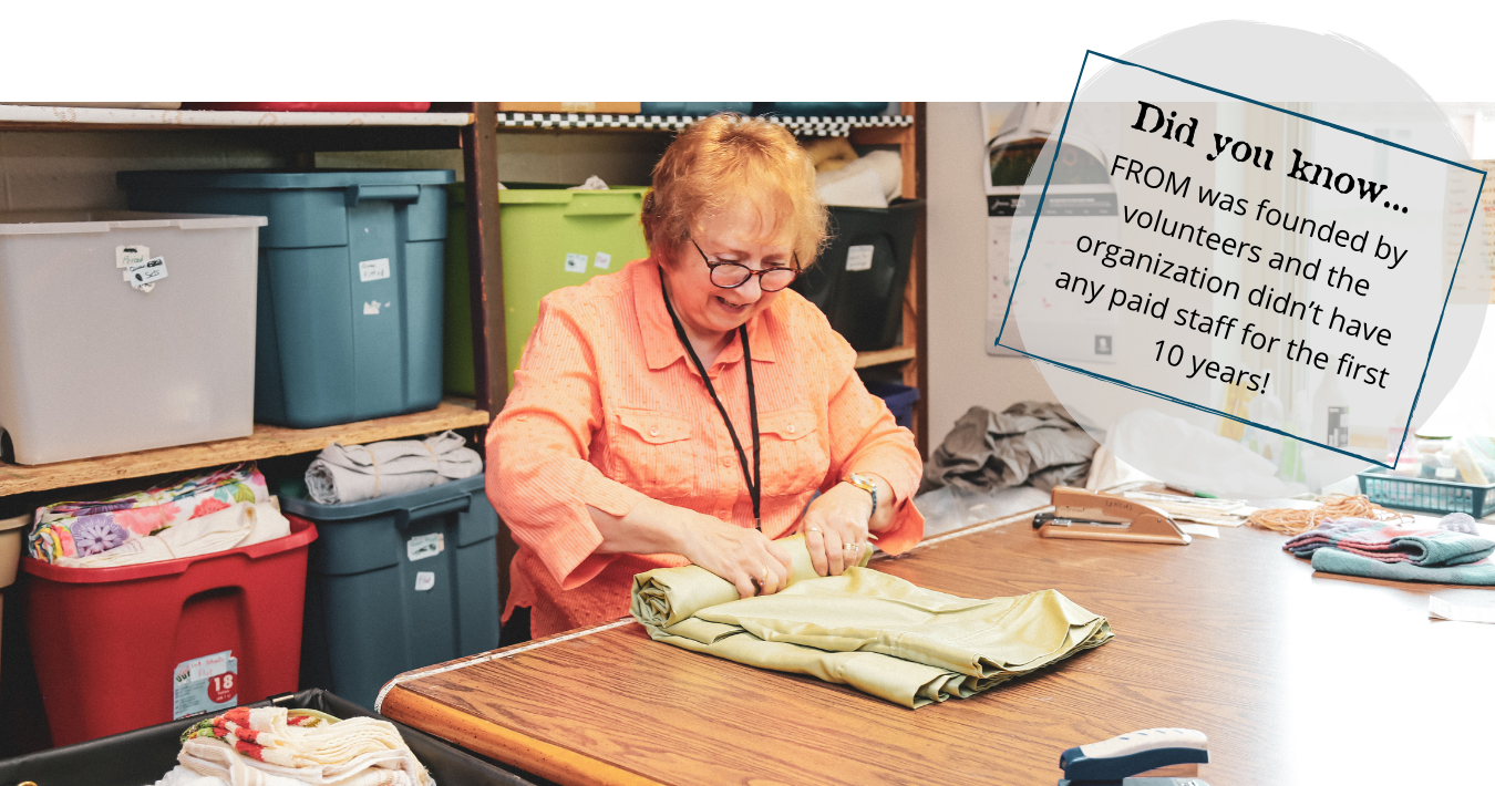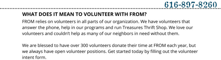 We are blessed to have over 300 volunteers donate their time at FROM each year, but we always have open volunteer positions.